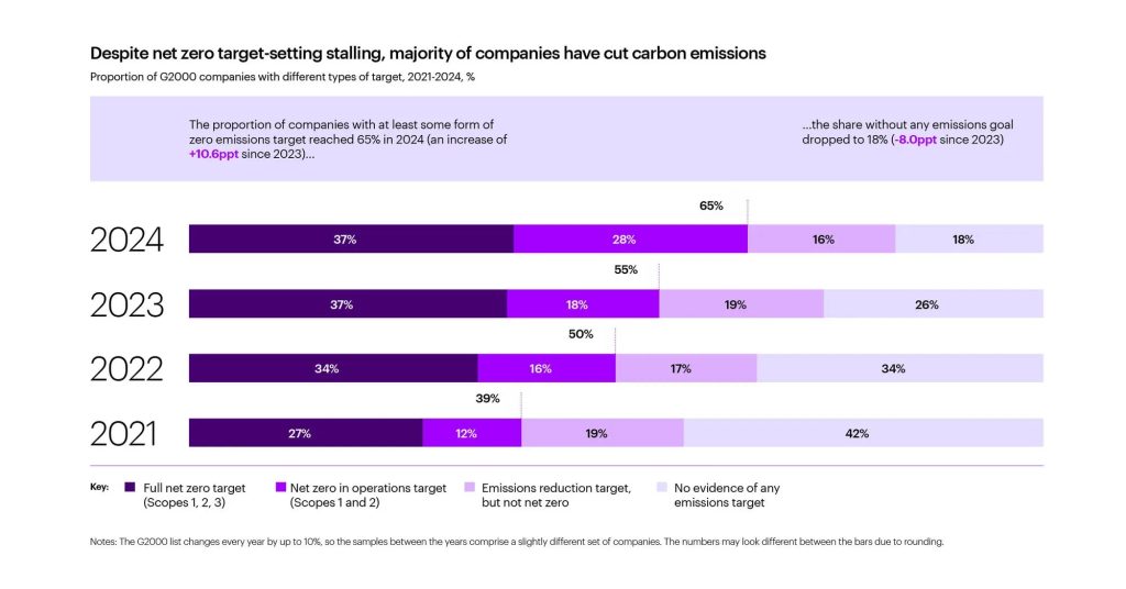 Στην τέταρτη έκδοσή της, η μελέτη της Accenture “Destination Net Zero” αποτελεί μια ανάλυση των εταιρικών δεσμεύσεων για μηδενικές εκπομπές, των πρωτοβουλιών μείωσης του άνθρακα καθώς και των δεδομένων εκπομπών από τις 2.000 μεγαλύτερες εταιρείες παγκοσμίως. Η μελέτη διαπίστωσε ότι ενώ το ποσοστό των εταιρειών με στόχο επίτευξης μηδενικών εκπομπών έχει σταθεροποιηθεί στο 37%, περισσότερες από τις μισές (52%) εταιρείες έχουν μειώσει τόσο τις εκπομπές άνθρακα όσο και την ένταση των εκπομπών τους από τότε που υιοθετήθηκε η Συμφωνία των Παρισίων το 2016.