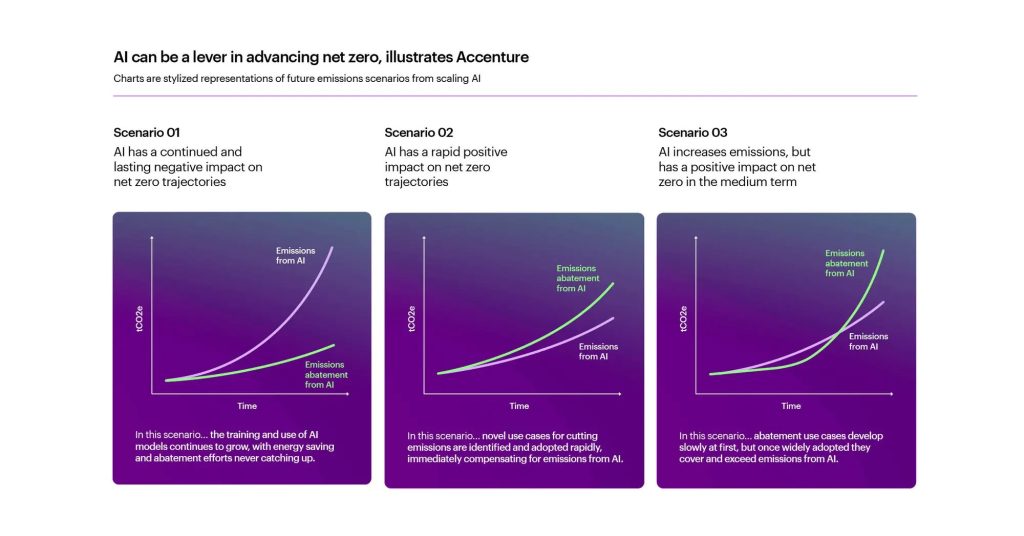 Η Accenture συμπεριέλαβε στην ανάλυσή της την αναμενόμενη αύξηση της χρήσης εξοπλισμού για την AI στα κέντρα δεδομένων (data centers) παγκοσμίως και εκτίμησε ότι οι εκπομπές που σχετίζονται με την AI θα υπερδεκαπλασιαστούν, από 68 σε 718 εκατομμύρια τόνους CO2e έως το 2030, ελλείψει σημαντικής καινοτομίας στα ενεργειακά συστήματα, στην υπολογιστική τεχνολογία και τους αλγόριθμους. Ωστόσο, τα περισσότερα διοικητικά στελέχη είναι αισιόδοξα για τις δυνατότητες της AI στην μείωση των εκπομπών. Όταν ρωτήθηκαν για τις προσδοκίες τους αναφορικά με το πώς η AI θα επηρεάσει τις εκπομπές παγκοσμίως, τα περισσότερα διοικητικά στελέχη αναμένουν ότι θα μειώσει τις εκπομπές (42%) παρά ότι θα τις αυξήσει (27%) βραχυπρόθεσμα (1 έως 3 χρόνια), ενώ η πλειοψηφία τους (65%) αναμένει ότι η AI θα μειώσει τις εκπομπές μακροπρόθεσμα (10+ χρόνια)