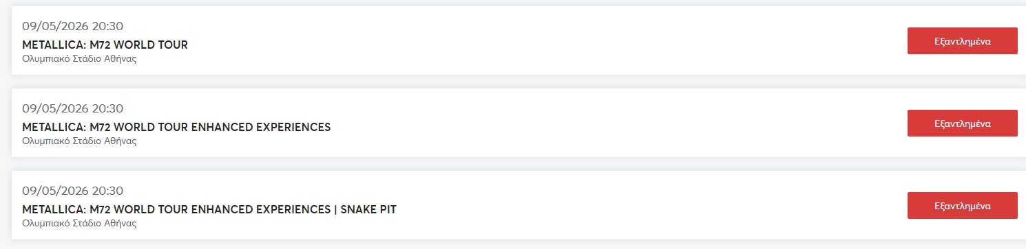 Μόλις δύο ώρες χρειάστηκαν για να ανακοινωθεί το sold out της συναυλίας των Metallica στο ΟΑΚΑ, η οποία έχει προγραμματιστεί για τις 9 Μαΐου 2026, στο πλαίσιο της παγκόσμιας περιοδείας τους M72 WORLD TOUR. Όπως ανακοίνωσε η Ticketmaster, όλα τα εισιτήρια εξαντλήθηκαν το πρωί της Παρασκευής 30 Μαΐου, λίγη ώρα μετά το άνοιγμα της γενικής προπώλησης.
