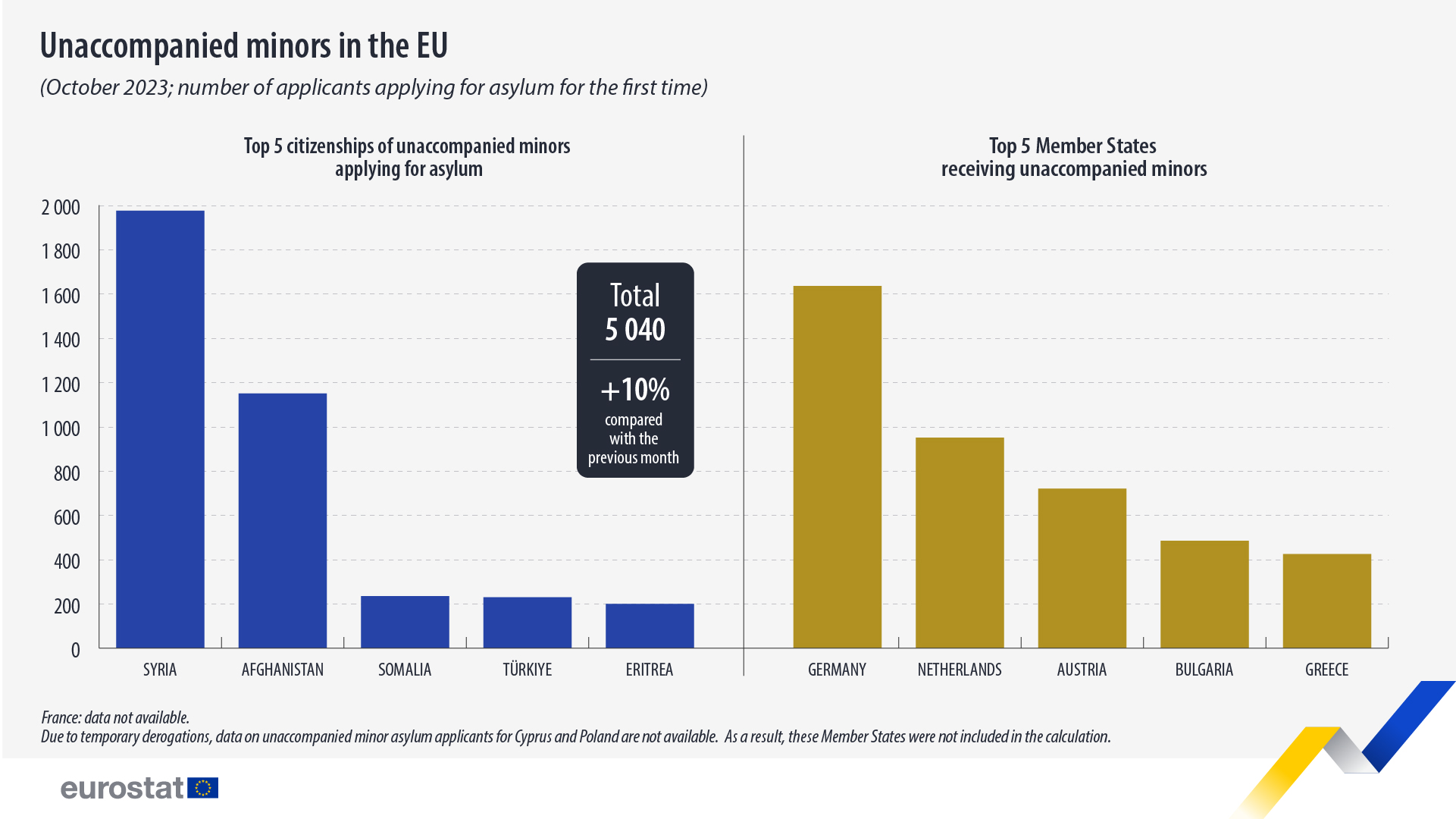 Τον Οκτώβριο του 2023, 5.040 ασυνόδευτοι ανήλικοι υπέβαλαν αίτηση ασύλου για πρώτη φορά στην ΕΕ, κυρίως από τη Συρία (1.975) και το Αφγανιστάν (1.150).