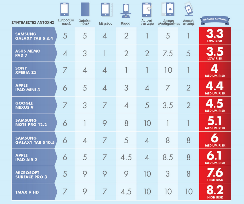 H αμερικανική SquareTrade, μια εταιρεία που παρέχει συμβόλαια ασφάλισης smartphone και tablet και στην Ελλάδα, δημιούργησε μια λίστα με τα δέκα πιο ανθεκτικά και πιο ευπαθή tablet που κυκλοφορούν στην αγορά των ΗΠΑ, την εορταστική περίοδο του 2014.