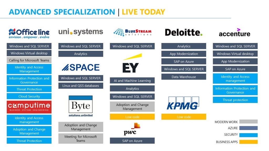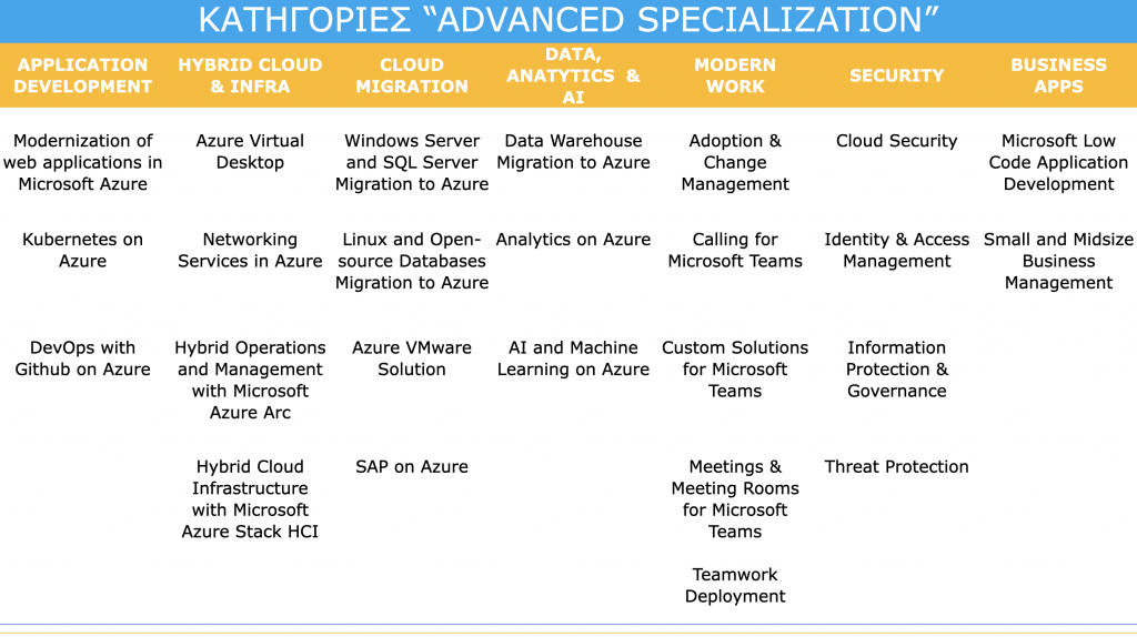 Η διαδικασία πιστοποίησης στελεχών και επιχειρήσεων από τη Microsoft έχει δύο διακριτές διαφορές. Από τη μία διαθέτουμε πιστοποιήσεις (certifications) ψηφιακών δεξιοτήτων που απευθύνονται στους απασχολούμενους των εταιρειών και διακρίνονται σε δύο κατηγορίες, βασικές (fundamental) και εξειδικευμένες (role-based), ανάλογα με το επίπεδο των γνώσεων που πιστοποιούνται – εδώ ολόκληρη η λίστα. Από την άλλη υπάρχουν τα λεγόμενα PhD της τεχνολογικής μετεκπαίδευσης που αφορούν τους ίδιους οργανισμούς // επιχειρήσεις και αναφέρονται ως «Microsoft Advanced Specialization». «Το Advanced Specialization επιτρέπει στους συνεργάτες της Microsoft να διαφοροποιηθούν από τον ανταγωνισμό, επιδεικνύοντας βαθιά κατάρτιση και γνώσεις στις τεχνολογικές περιοχές που αποτελούν προτεραιότητα για αυτούς τεχνικά και εμπορικά. Με πιο απλά λόγια, είναι θα έλεγα ένα εισιτήριο για να χτίσουν πιο γρήγορα και πιο σίγουρα ισχυρές σχέσεις με τους πελάτες τους».