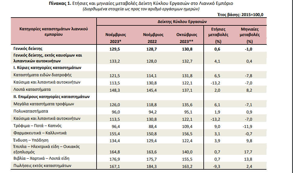 Σύμφωνα με τα στοιχεία που ανακοίνωσε η ΕΛΣΤΑΤ την Τετάρτη, ο Γενικός Δείκτης Κύκλου Εργασιών κατά τον μήνα Νοέμβριο 2023, σε σύγκριση με τον αντίστοιχο δείκτη του Νοεμβρίου 2022, παρουσίασε αύξηση 0,6% και σε σύγκριση με τον αντίστοιχο δείκτη του Οκτωβρίου 2023 μείωση 1,0%.