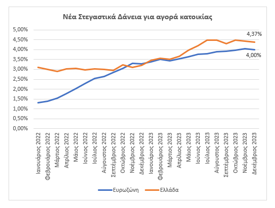 Σε ότι αφορά τα νέα δάνεια, και ιδίως τις χορηγήσεις στεγαστικών το επιτόκιο το Δεκέμβριο ανήλθε στο 4,37% έναντι 3,60% το Δεκέμβριο του 2022 (+77 μονάδες βάσης).
