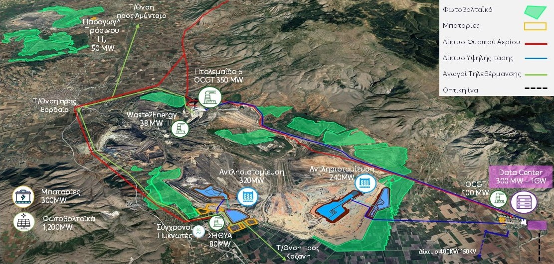 Το σχέδιο της ΔΕΗ για τη μετατροπή της Δυτικής Μακεδονίας σε τεχνολογικό και πράσινο ενεργειακό κόμβο για τη χώρα και τη ΝΑ Ευρώπη περιλαμβάνει επενδύσεις σε ανανεώσιμες πηγές, αποθήκευση ενέργειας (μπαταρίες και αντλησιοταμίευση), πυκνωτές, υδρογόνο, αξιοποίηση απορριμμάτων, παραγωγή ενέργειας από φυσικό αέριο, τηλεθέρμανση, αποκατάσταση εδαφών και κυρίως την εγκατάσταση data center που θα είναι ένα από τα μεγαλύτερα στην Ευρώπη.