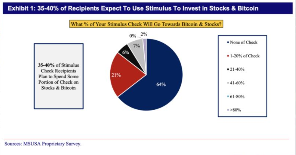 Η Mizuho Financial Group ρώτησε 235 άτομα με εισόδημα κάτω από 150.000 δολ. Έως και το 40% των ερωτηθέντων δήλωσαν ότι θα επενδύσουν το βοήθημα που θα λάβουν από το κράτος σε Bitcoin και μετοχές, ενώ το 61% δηλώνει ότι θα επιλέξει Bitcoin αντί των μετοχών.