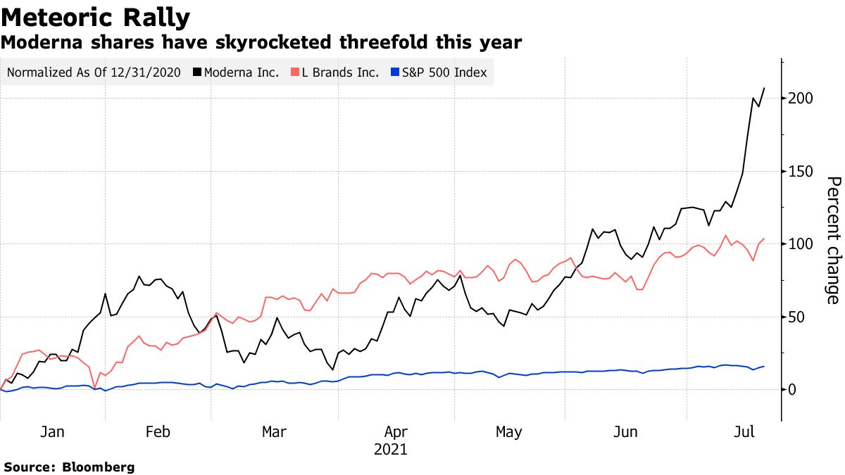 Με κέρδη που μόνο για τη φετινή χρονιά ανέρχονται στο +180%, η μετοχή της Moderna ξεπέρασε την μέχρι τώρα νούμερο ένα κερδισμένη του δείκτη L Brands Inc, η οποία καταγράφει άνοδο κατά περίπου 100%.