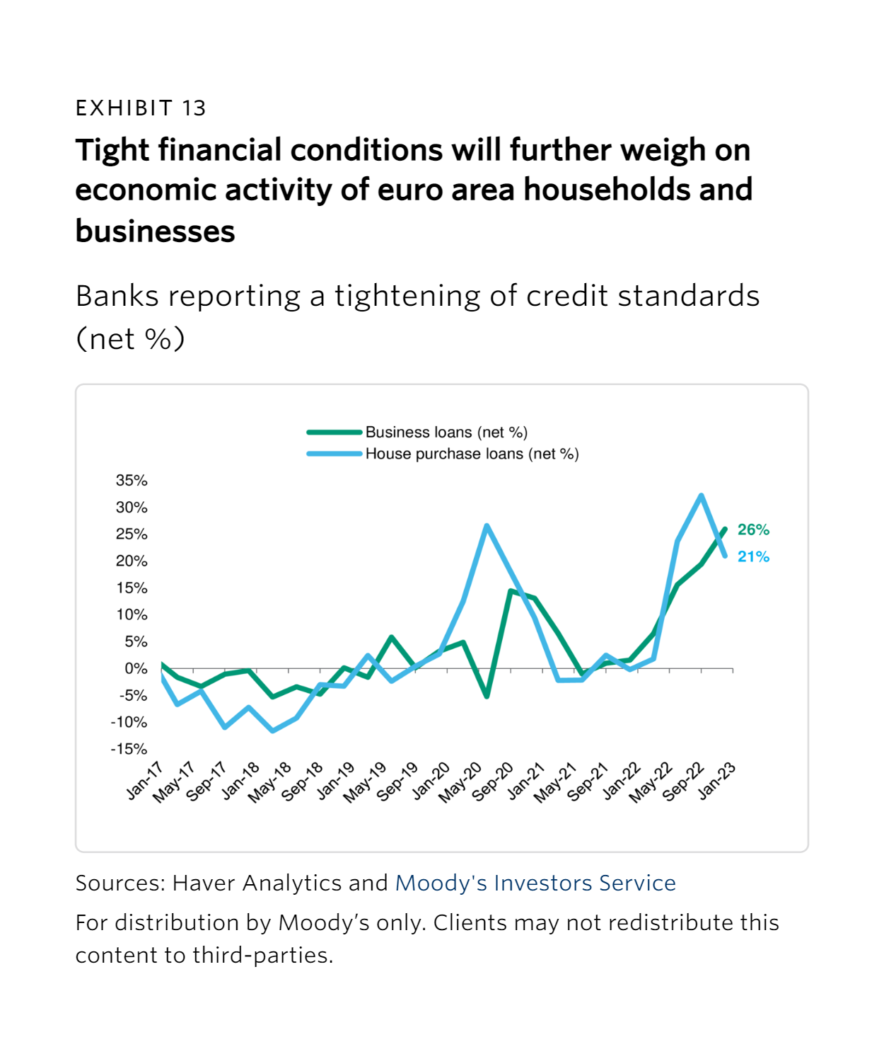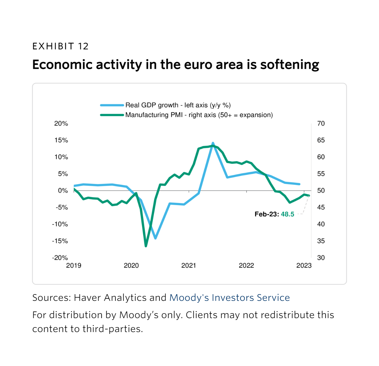 Το πραγματικό ΑΕΠ της ζώνης του ευρώ αυξήθηκε κατά 3,5% το 2022. H Μοοdy’s αναμένει αύξηση 0,5% το 2023 και 1,2% το 2024. Αν και οι προβλέψεις για το 2023 είναι καλύτερες από τις προβλέψεις του Νοεμβρίου, υπονοούν ότι η παραγωγή θα μείνει στάσιμη. Ο πληθωρισμός πιθανότατα θα μειωθεί αργά, καθώς οι δευτερογενείς επιπτώσεις λόγω των υψηλών τιμών της ενέργειας επηρεάζουν τις πληθωριστικές πιέσεις.
