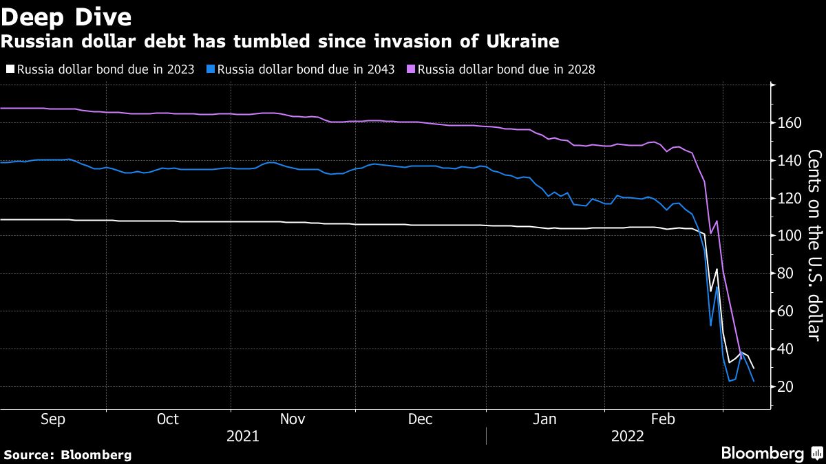 Τις ημέρες πριν από την εισβολή της Ρωσίας στην Ουκρανία τον περασμένο μήνα, το χρέος διαπραγματευόταν πάνω από το όριο. Αν και είναι σπάνιο το δημόσιο χρέος να πέφτει σε μονοψήφια νούμερα, η Morgan Stanley είπε ότι τα ομόλογα της Ρωσίας «θα μπορούσαν να πλησιάσουν». Ο Λίβανος και η Βενεζουέλα είναι τα μοναδικά παραδείγματα χρέους μιας χώρας που διολίσθησε τόσο χαμηλά.