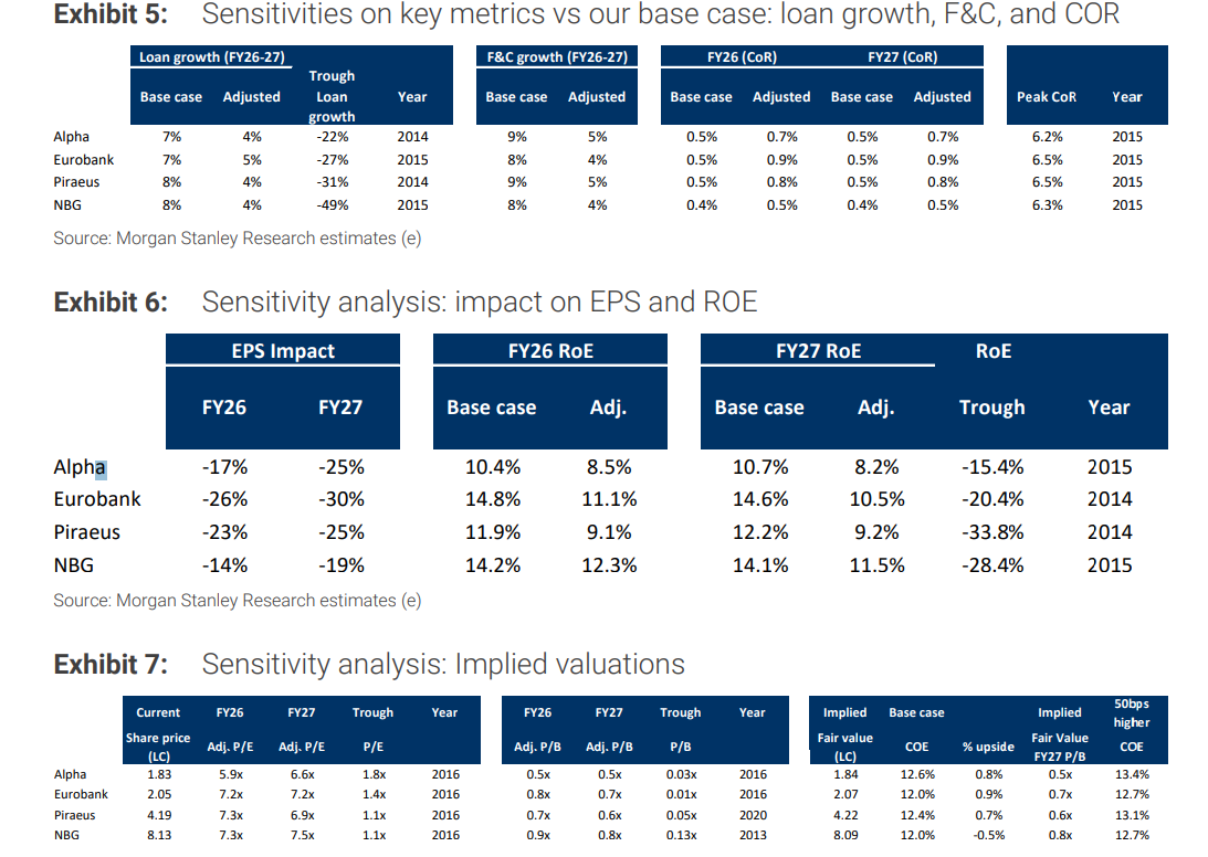 Αν μαζί με τα παραπάνω ληφθεί υπόψη αύξηση του κόστους κεφαλαίου (COE) κατά 50 μονάδες βάσης, συνεπάγεται ότι, στις τρέχουσες αποτιμήσεις, οι ελληνικές τράπεζες θα έχουν ένα εξομαλυμένο ROE για το 2027 της τάξης του ~8-11,5%, έναντι του βασικού σεναρίου για ~11-15%.