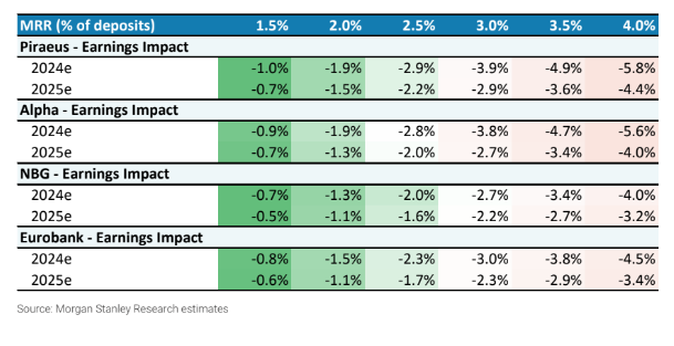Η Morgan Stanley εκτιμά πως «ο αντίκτυπος μιας πιθανής αλλαγές στα κέρδη των ελληνικών τραπεζών για το 2024 θα μπορούσε να είναι από 4% έως 6% και από 3% έως 4% για το 2025. Υποθέτοντας ένα ελάχιστο αποθεματικό στο 2%, τα αντίστοιχα ποσοστά θα ήταν 1% – 2% και 1% – 1,5%, αντίστοιχα.