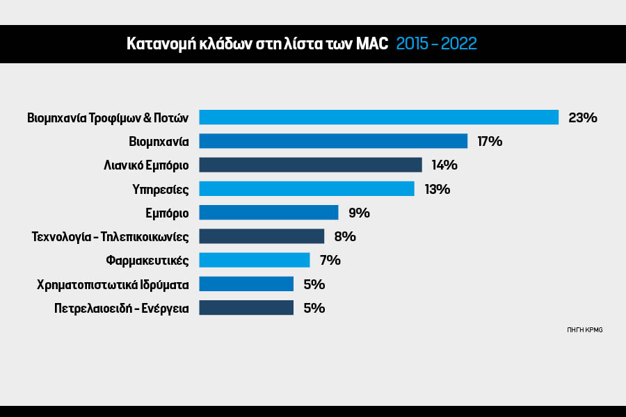 Έξι εταιρείες εµφανίζονται σταθερά κάθε χρονιά στη λίστα των MAC, προερχόµενες από τους κλάδους: «Τρόφιµα και ποτά» (Coca-Cola Τρία Έψιλον), «Βιοµηχανία» (Παπαστράτος, Τιτάν), «Λιανικό εµπόριο» (AB Βασιλόπουλος), «Υπηρεσίες» (Αegean Airlines) και «Τεχνολογία / Τηλεπικοινωνίες» (OTE Όµιλος Εταιρειών). Έχει ενδιαφέρον να σηµειωθεί ότι και φέτος δεν είχαµε ισοψηφίες, παρά μόνο στη θέση 18 (Μέλισσα Κίκιζας, Isquare) και στη θέση 20 (Σαράντης, Kaizen Gaming). Ο σηµαντικός αριθµός ψήφων -και, άρα, η µεγάλη συµµετοχή των στελεχών στην ψηφοφορία- εκτιµάται ότι οφείλεται στην εδραίωση του θεσµού στην αγορά.