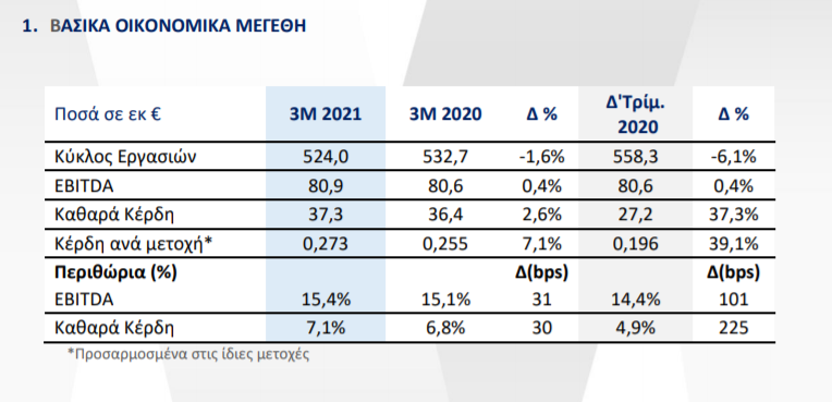 Tα βασικά οικονομικά μεγέθη για το α’ τρίμηνο 2021 ανακοίνωσε η MYTLINEOS (RIC: MYTr.AT, Bloomberg: MYTIL.GA). Ειδικότερα, σύμφωνα με την εταιρεία, ο Κύκλος Εργασιών και τα Κέρδη προ Φόρων, Τόκων και Αποσβέσεων (EBITDA) ανήλθαν σε €524 εκατ. και €81 εκατ. αντίστοιχα για το Α΄ Τρίμηνο του 2021, παραμένοντας στα ίδια επίπεδα τόσο με την αντίστοιχη περίοδο του προηγούμενου έτους όσο και με το αμέσως προηγούμενο τρίμηνο.