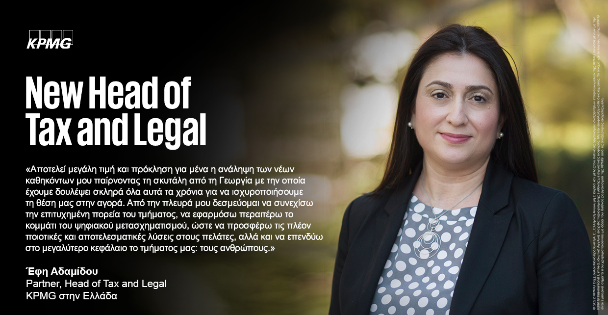Τη θέση της Επικεφαλής του Φορολογικού και Νομικού τμήματος της KPMG στην Ελλάδα αναλαμβάνει από 1η Οκτωβρίου η Έφη Αδαμίδου, παίρνοντας τη σκυτάλη από την Γεωργία Σταματέλου.