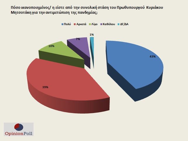 Την κυριαρχία του Κυριάκου Μητσοτάκη στο πολιτικό σκηνικό της χώρας επιβεβαιώνει η νέα έρευνα της Opinion Poll στο διάστημα μετά την αποτελεσματική διαχείριση δύο κρίσεων: του Έβρου και της πανδημίας. Σύμφωνα με την έρευνα, το 82% δηλώνει ικανοποιημένο από την συνολική στάση του πρωθυπουργού στην αντιμετώπιση της πανδημίας, ενώ εμφανίζει υψηλή δημοφιλία της τάξης του 69% με τον Αλέξη Τσίπρα να παρουσιάζει δημοφιλία 28%.