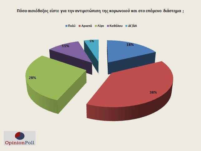 Για το πρώτο, φαίνεται το 40% να αισθάνεται λίγο ή καθόλου αισιοδοξία για την αντιμετώπιση της πανδημίας στο επόμενο διάστημα έναντι του 56% που δηλώνει πολύ και αρκετά αισιόδοξο. Υπάρχει μία σημαντική μερίδα της κοινωνίας που αισθάνεται φόβο, αβεβαιότητα με δεδομένα τα σταδιακά μέτρα άρσης της καραντίνας.