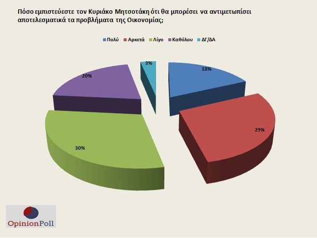 Είναι χαρακτηριστικό ότι στην σχετική ερώτηση το 47% δηλώνει πολύ και αρκετή εμπιστοσύνη στον Κυριάκο Μητσοτάκη έναντι 50% που δηλώνει λίγο και καθόλου εμπιστοσύνη. Υπάρχει φόβος, απαισιοδοξία και αβεβαιότητα που φαίνεται ότι οδηγεί σε μία στάση σχετικού κρατήματος και επιφύλαξης απέναντι στην αντιμετώπιση της οικονομικής κρίσης από τον πρωθυπουργό παρά το ισχυρό προφίλ και πολιτικό απόθεμα που δείχνει να διαθέτει.