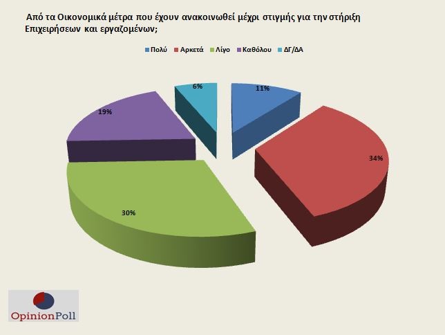 Σε απόσταση βρίσκεται η ικανοποίηση από τα οικονομικά μέτρα στήριξης επιχειρήσεων και εργαζομένων με το 44,4% να δηλώνει πολύ και αρκετά ικανοποιημένο, με το 49,4% να δηλώνει λίγο και καθόλου.