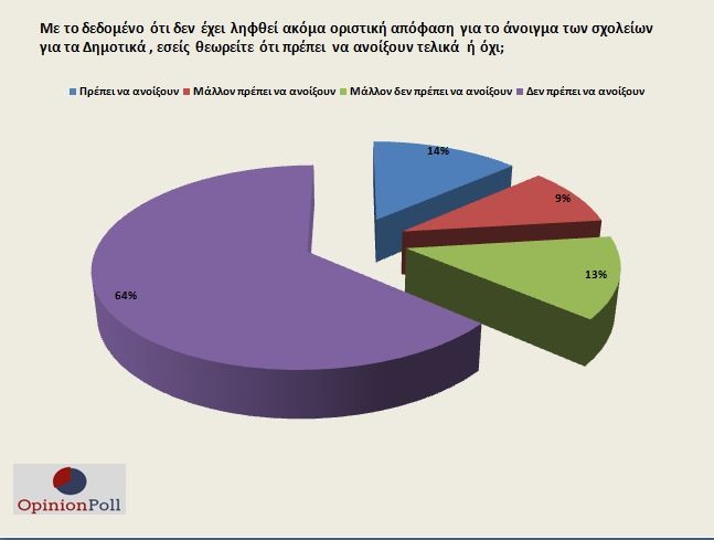 Ιδιαίτερο ενδιαφέρον παρουσιάζει η απάντηση στο ερώτημα αν θα πρέπει να ανοίξουν τα Δημοτικά Σχολεία. Μία συντριπτική πλειοψηφία της τάξης του 77% απαντά όχι, ενώ το 23% απαντά ναι. Πρόκειται για εύρημα που δύσκολα μπορεί να αγνοηθεί.