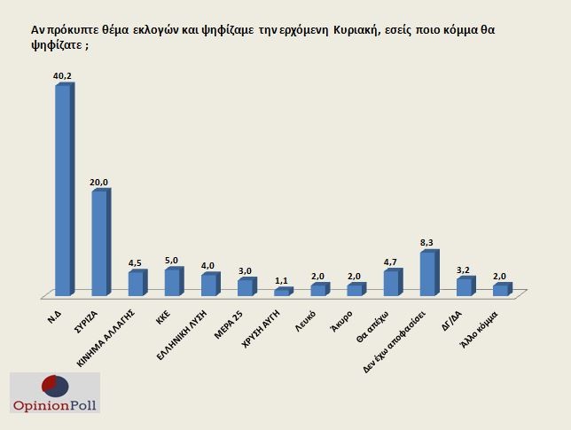 Η ΝΔ συγκεντρώνει 40,2% (40% στην τελευταία μέτρηση) έναντι 20% του ΣΥΡΙΖΑ (20,2%).