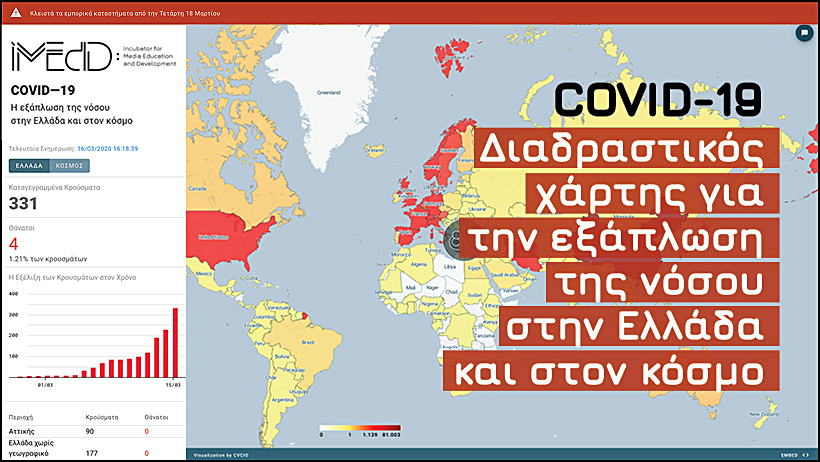 Το iMEdD Lab παρουσιάζει μια νέα διαδραστική εφαρμογή που ανανεώνεται ημερησίως με σκοπό την ενημέρωση της ελληνικής δημοσιογραφικής κοινότητας και κάθε ενδιαφερόμενου για την εξάπλωση του Covid-19 στην Ελλάδα και στον κόσμο, με τη χρήση ενός απλού, εύχρηστου εργαλείου.