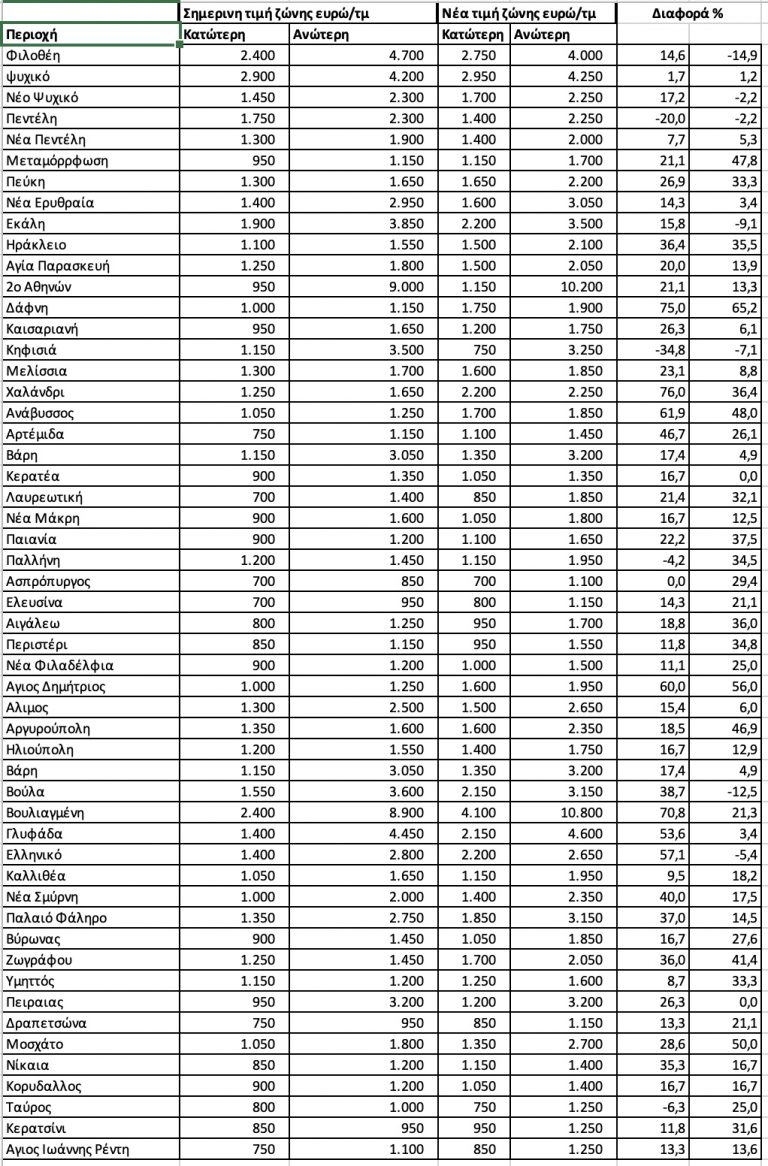 Σημαντικές αυξήσεις εντοπίζονται σε ζώνες περιοχών, μεταξύ άλλων, όπως: