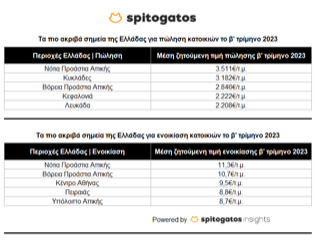 Οι μεγαλύτερες αυξήσεις στη μέση ζητούμενη τιμή πώλησης κατοικιών το δεύτερο τρίμηνο του 2023 σε σχέση με το αντίστοιχο διάστημα του προηγούμενου έτους εντοπίζονται στον Δήμο Θεσσαλονίκης (+21%), τα Προάστια Θεσσαλονίκης (+17%) και τα Νότια Προάστια Αττικής (+15%). Όσον αφορά τη μέση ζητούμενη τιμή ενοικίασης κατοικιών, μεγάλες αυξήσεις σε σχέση με το δεύτερο τρίμηνο του 2022 παρατηρήθηκαν στα Προάστια Θεσσαλονίκης (+8%), τα Νότια Προάστια Αττικής (+7%) και τα Βόρεια Προάστια Αττικής (+7%).