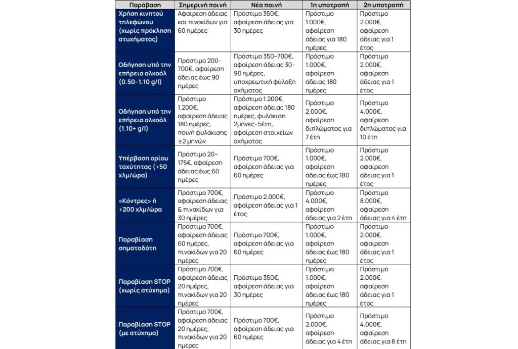 Στο πλαίσιο αυτό, σύμφωνα με κυβερνητικές πηγές, καθιερώνεται κλιμακωτού χαρακτήρα ποινολόγιο, ώστε να επιβάλλονται αυστηρότερες συνέπειες σε υπότροπους, οι οποίοι επαναλαμβάνουν σοβαρά παραπτώματα, ενώ υπάρχουν και πρόνοιες για αυξημένες κυρώσεις στην περίπτωση που ο παραβάτης εμπλακεί σε ατύχημα.
