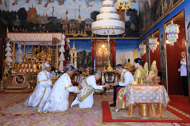 Η τελετή, που μεταδίδεται απευθείας από τα τηλεοπτικά δίκτυα της Ταϊλάνδης, είναι ένα μίγμα βουδιστικών και βραχμανικών εθίμων και ξεκίνησε στις 10:09 (τοπική ώρα), μια ώρα που επιλέχθηκε βάσει των άστρων.