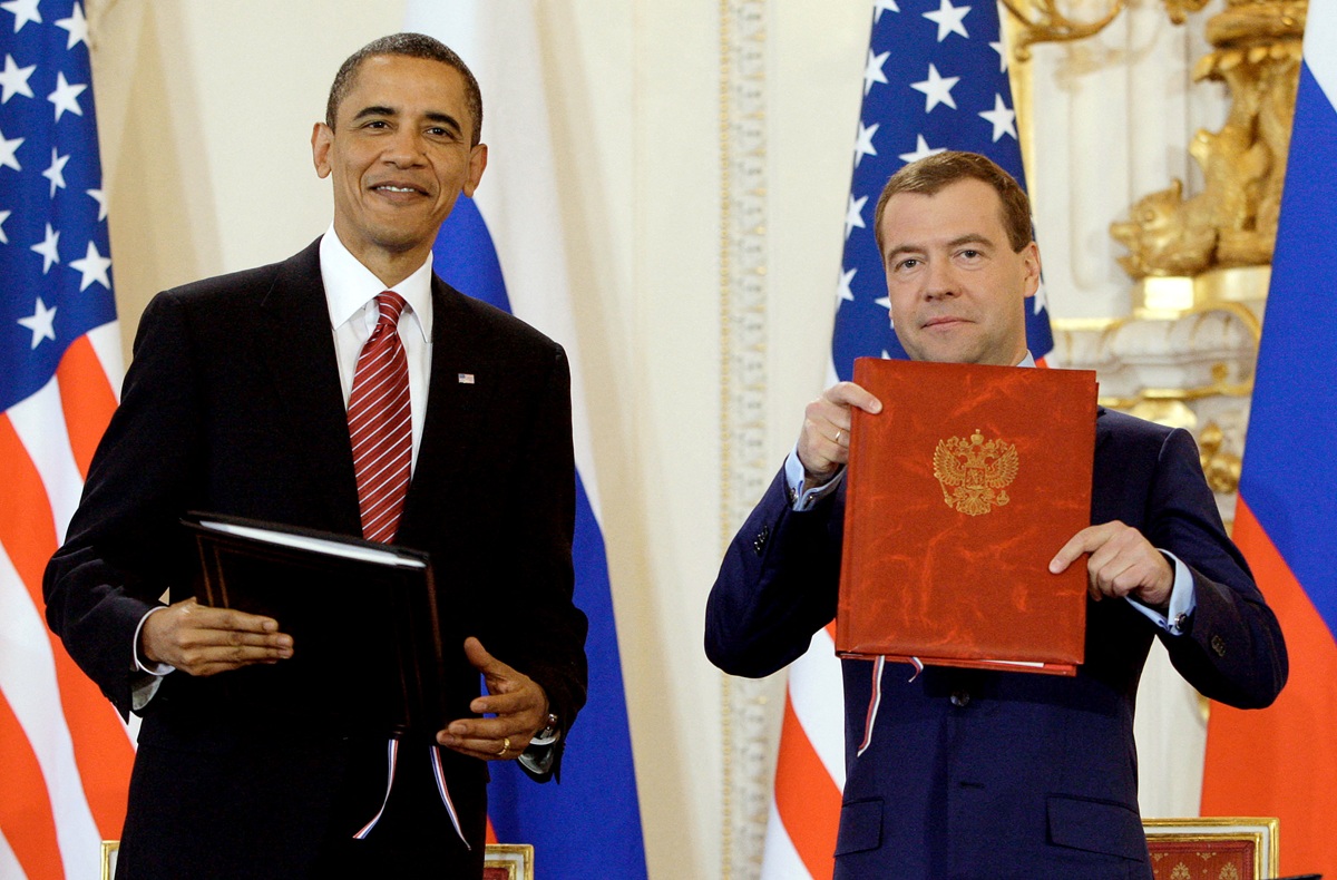 US President Barack Obama (L) and Russian President Dmitry Medvedev pose with the signed new START Treaty documents at the Prague Castle in Prague on April 8, 2010. US President Barack Obama said the new nuclear disarmament treaty he and Russian President Dmitry Medvedev signed in Prague on Thursday was a "historic" event that will make the world "safer, more secure." "I’m honoured to be here in the Czech Republic with President Medvedev and our Czech hosts to mark this historic completion of the new START treaty," Obama told reporters at Prague Castle after the signing ceremony. AFP PHOTO / RIA NOVOSTI / KREMLIN POOL / DMITRY ASTAKHOV (Photo by DMITRY ASTAKHOV / RIA NOVOSTI / AFP) Photo: AFP