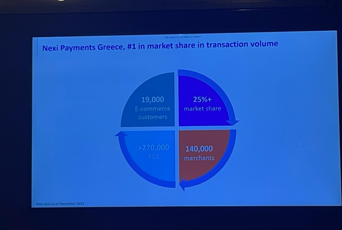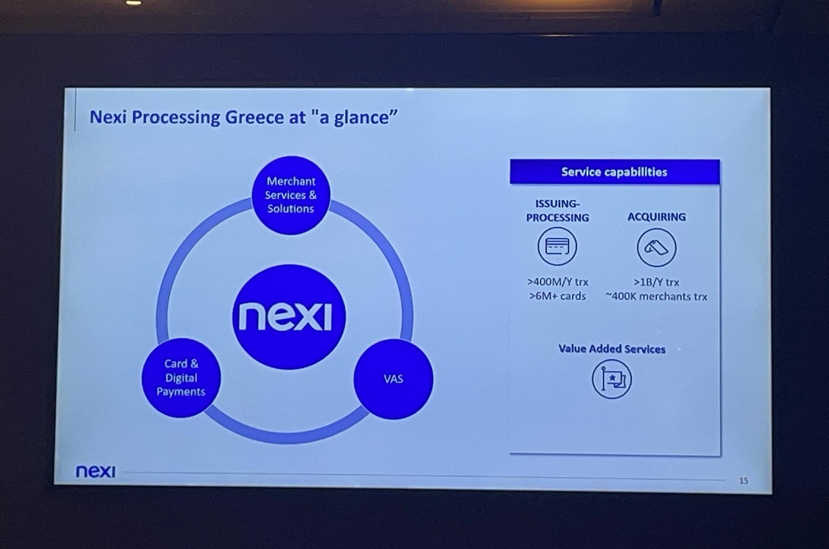 Συγκεκριμένα για την Ελλάδα, ο κ. Νίκος Παπαδόγλου, υπογράμμισε ότι μέσω της Nexi Processing ο όμιλος προσφέρει ψηφιακές υποδομές και υπηρεσίες αιχμής σε χρηματοπιστωτικά ιδρύματα, κορυφαίες εταιρείες και δημόσιους φορείς στον τομέα του issuing και acquiring. Η Nexi Processing, διαχειρίζεται τις πληρωμές στην Ελλάδα και την ευρύτερη περιοχή κάθε δευτερόλεπτο κάθε ημέρας για περίπου 400.000 εμπορικά καταστήματα, πολλαπλούς εκδότες καρτών και εκατομμύρια καταναλωτές. Επί της ουσίας καλύπτει το 60% της αγοράς card issuing μέσα από τη συνεργασία της με 6 από τις 10 τράπεζες στην Ελλάδα.