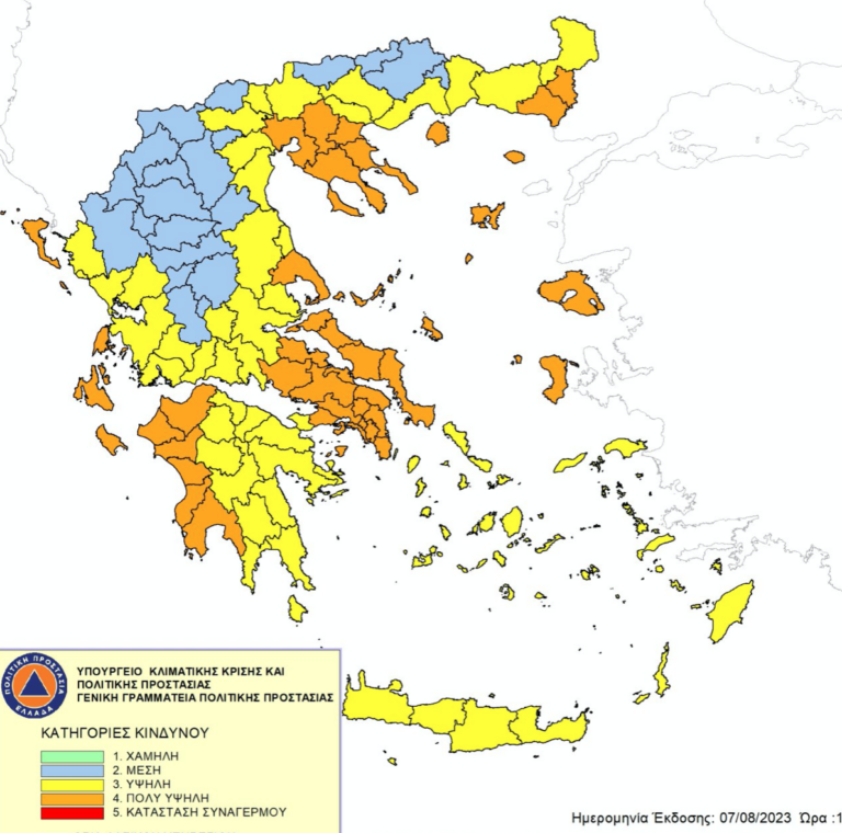 Ειδικότερα, σύμφωνα με τον Ημερήσιο Χάρτη Πρόβλεψης Κινδύνου Πυρκαγιάς που εκδίδει η Γενική Γραμματεία Πολιτικής Προστασίας του Υπουργείου Κλιματικής Κρίσης και Πολιτικής Προστασίας, για σήμερα, Τρίτη 08-08-2023,, προβλέπεται πολύ υψηλός κίνδυνος πυρκαγιάς (κατηγορία κινδύνου 4) στις Π.Ε. Θεσσαλονίκης και Χαλκιδικής.