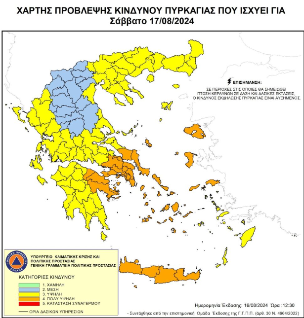 Σύμφωνα με το Χάρτη Πρόβλεψης Κινδύνου Πυρκαγιάς που εκδίδει η Γενική Γραμματεία Πολιτικής Προστασίας του Υπουργείου Κλιματικής Κρίσης & Πολιτικής Προστασίας (civilprotection.gov.gr), για σήμερα, Σάββατο 17 Αυγούστου 2024, προβλέπεται για τις εξής περιοχές: