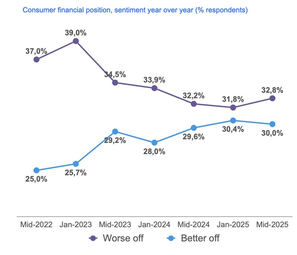 Η έρευνα αυτή δείχνει ότι η συνεχιζόμενη αστάθεια έχει ριζώσει βαθιά μια επίμονη επιφυλακτικότητα στην ψυχολογία των καταναλωτών, η οποία επηρεάζει τις δαπάνες.
