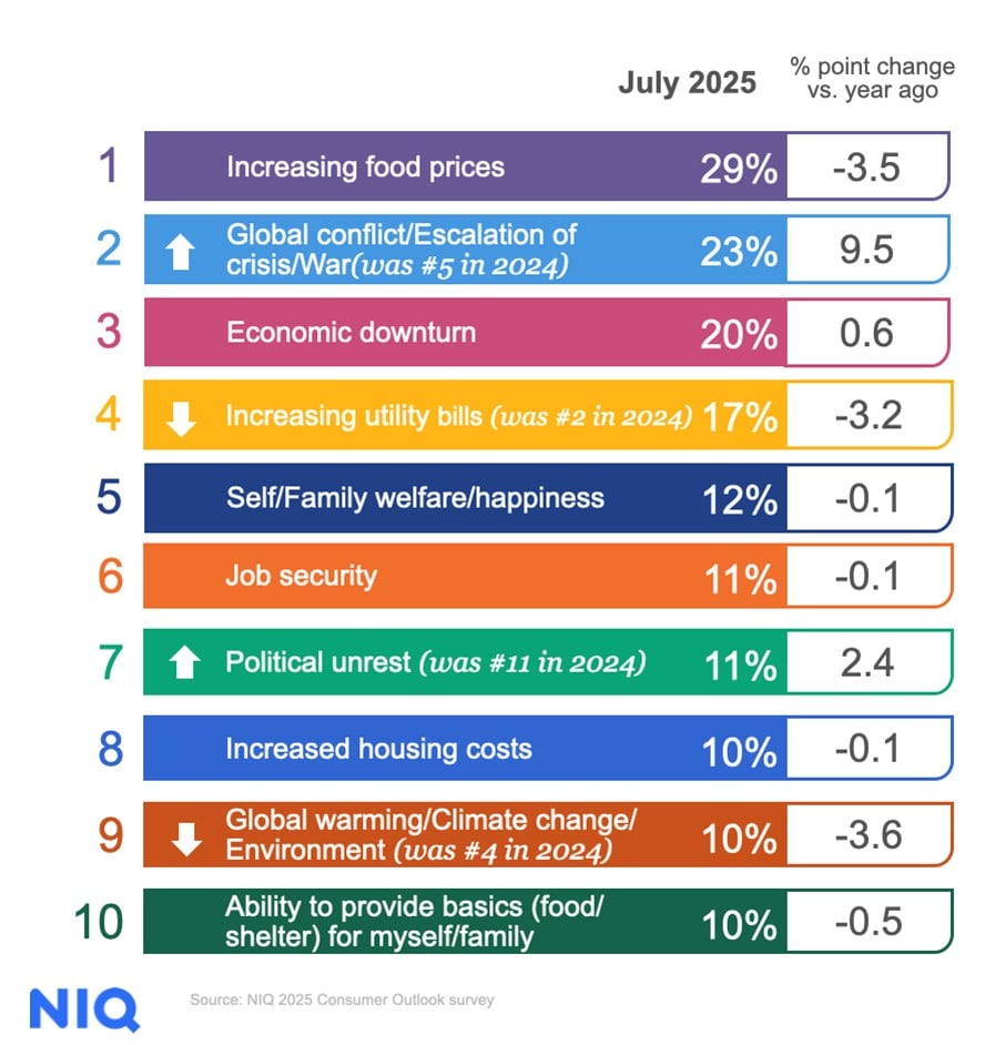 Οι βασικές τους ανησυχίες παραμένουν οι αυξημένες τιμές στα τρόφιμα – αν και με μειωμένο ποσοστό σε σχέση με έναν χρόνο πριν – οι παγκόσμιες διαμάχες/ πόλεμοι που βρέθηκαν στην 2η θέση από την 5η πέρυσι και η οικονομική ύφεση. Σοβαρή παραμένει και η ανησυχία τους για τους αυξημένους λογαριασμούς υπηρεσιών κοινής ωφέλειας.