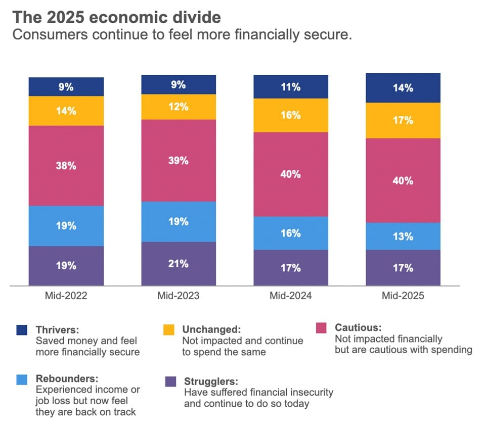 Σύμφωνα με την έρευνα, όλο και περισσότεροι καταναλωτές αισθάνονται περισσότεροι ασφαλείς οικονομικά (thrivers), ωστόσο το μεγαλύτερο κομμάτι (40%) αφορά αυτούς που δεν καταστράφηκαν αλλά παραμένουν επιφυλακτικοί και προσέχουν που και πόσα ξοδεύουν (cautious).