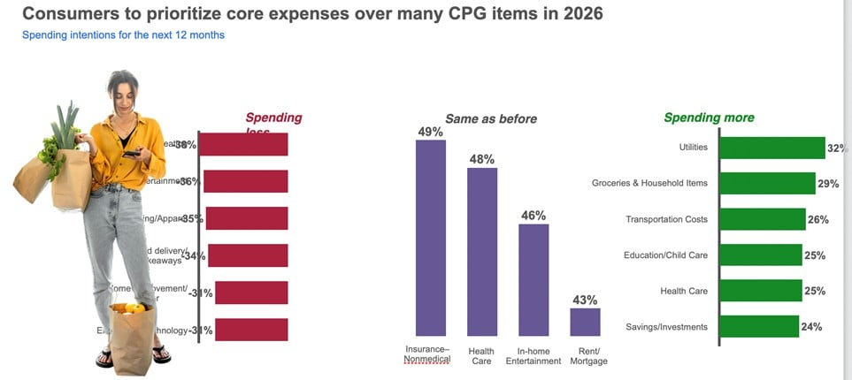 Σχετικά με τις προτεραιότητες του παγκόσμιου καταναλωτή για το 2026, ο κ. Δημοράγκας ανέφερε ότι οι καταναλωτές πρόκειται να ξοδέψουν περισσότερα χρήματα για λογαριασμούς υπηρεσιών κοινής ωφελείας, τρόφιμα και έξοδα μετακίνησης καθώς εκτιμούν ότι θα συνεχιστούν οι πληθωριστικές πιέσεις στις κατηγορίες αυτές.