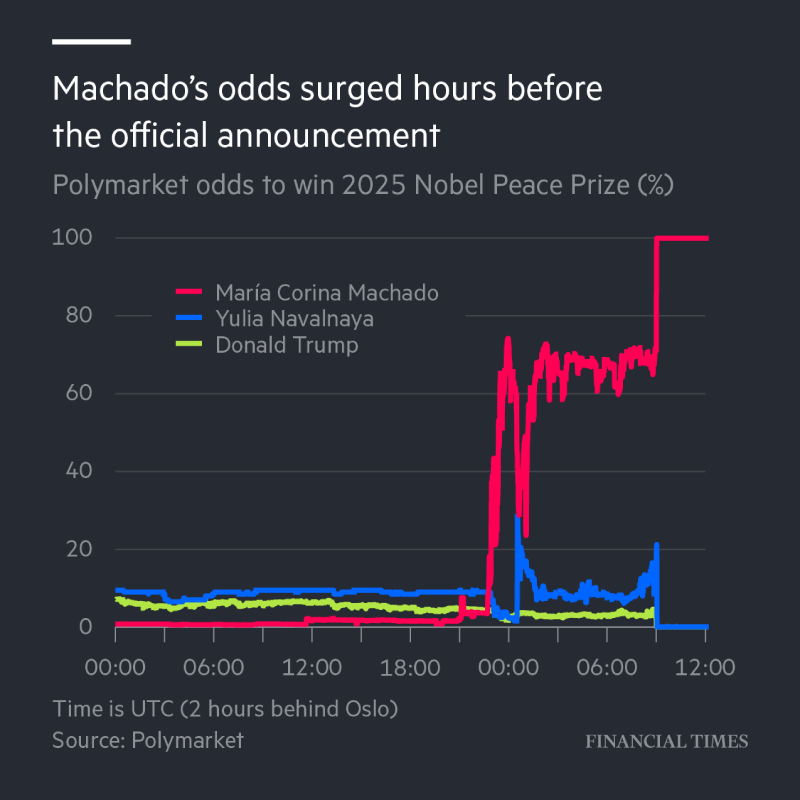Σύμφωνα με δεδομένα από την πλατφόρμα Polymarket, που δημοσίευσαν οι Financial Times και η Guardian, η πιθανότητα της Ματσάδο να κερδίσει το Νόμπελ Ειρήνης αυξήθηκε από περίπου 3,7% σε πάνω από 70% μεταξύ μεσονυκτίου και 2:00 π.μ. ώρα Όσλο — λιγότερο από δέκα ώρες πριν από την ανακοίνωση.