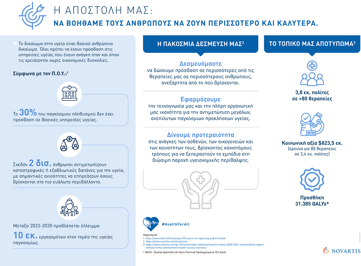 Το 2021, 3,4 εκατ. Έλληνες πολίτες είχαν πρόσβαση σε 80 θεραπείες με 31.385 Ποιοτικά Προσαρμοσμένα Έτη Ζωής (QALYs). Η κοινωνική/πολλαπλασιαστική αξία των θεραπειών αυτών – μέσω της συνεισφοράς του υγιούς πληθυσμού στο Α.Ε.Π. της χώρας – ανήλθε σε $823,5 εκ. Επιπλέον, την ίδια χρονιά, η Novartis Hellas πραγματοποίησε 72 κλινικές μελέτες ύψους άνω των 7 εκατ. ευρώ, με 718 συμμετέχοντες, καθώς και 6 προγράμματα υποστήριξης ασθενών/πρόσβασης με 2.901 ωφελούμενους.