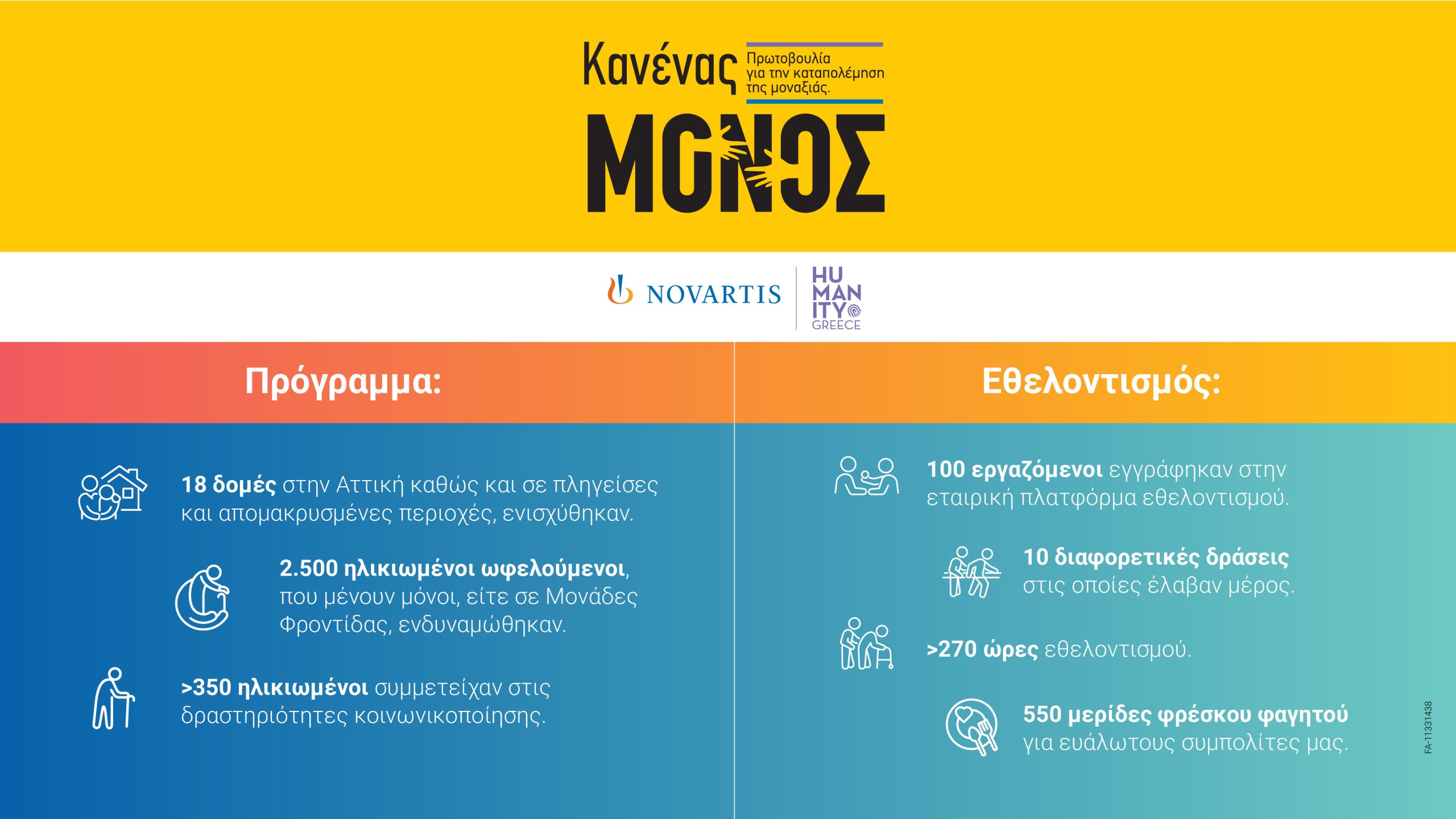 Η πρωτοβουλία εταιρικής υπευθυνότητας της Novartis Hellas, «Κανένας Μόνος», ενίσχυσε την ψυχική υγεία και βελτίωσε την ποιότητα ζωής των ηλικιωμένων από την αρχή του 2024. Με την υποστήριξη του Humanity Greece, το πρόγραμμα τόνωσε το αίσθημα κοινωνικής αλληλεγγύης και ανέδειξε το ζήτημα της μοναξιάς στην Τρίτη Ηλικία, επιβεβαιώνοντας τον ανθρωποκεντρικό προσανατολισμό και την αποστολή της εταιρείας, να βοηθάει τους ανθρώπους να ζουν περισσότερο και καλύτερα.