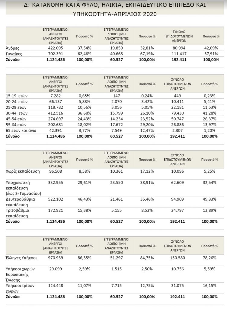 Το σύνολο των εγγεγραμμένων ανέργων, με κριτήριο την αναζήτηση εργασίας (αναζητούντων εργασία), για τον μήνα Απρίλιο 2020, ανήλθε σε 1.124.486 άτομα. Από αυτά 531.464 (ποσοστό 47,26%) είναι εγγεγραμμένα στο μητρώο του ΟΑΕΔ για χρονικό διάστημα ίσο ή και περισσότερο των 12 μηνών και 593.022 (ποσοστό 52,74%) είναι εγγεγραμμένα στο μητρώο του ΟΑΕΔ για χρονικό διάστημα μικρότερο των 12 μηνών.
