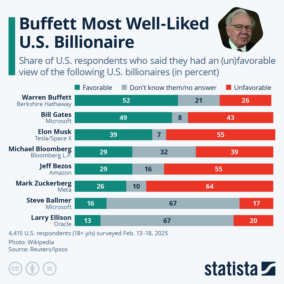 Ενώ οι περισσότεροι δισεκατομμυριούχοι χάνουν τη μάχη της κοινής γνώμης, ο Warren Buffett παραμένει η εξαίρεση — με το 52% των Αμερικανών να εξακολουθεί να τον βλέπει θετικά, ακόμη και λίγο πριν την αποχώρησή του από τη θέση του CEO.