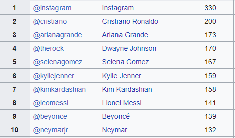 Παρ’ όλα αυτά ο Κριστιάνο Ρονάλντο δεν είναι πρώτος στη λίστα με τους περισσότερους followers, αφού την πρωτιά κατέχει το ίδιο το μέσο, το οποίο μετράει 330 εκατομμύρια ακόλουθους.