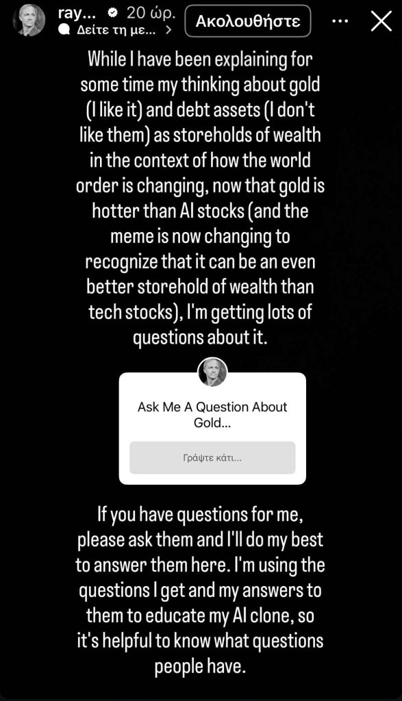 «Τώρα που ο χρυσός είναι “πιο καυτός” από τις μετοχές τεχνητής νοημοσύνης (και αλλάζει ήδη η τάση, καθώς θεωρείται καλύτερο αποθετήριο πλούτου από τις μετοχές τεχνολογίας), λαμβάνω πολλές ερωτήσεις σχετικά με αυτό το θέμα», έγραψε ο Ντάλιο την Τετάρτη.