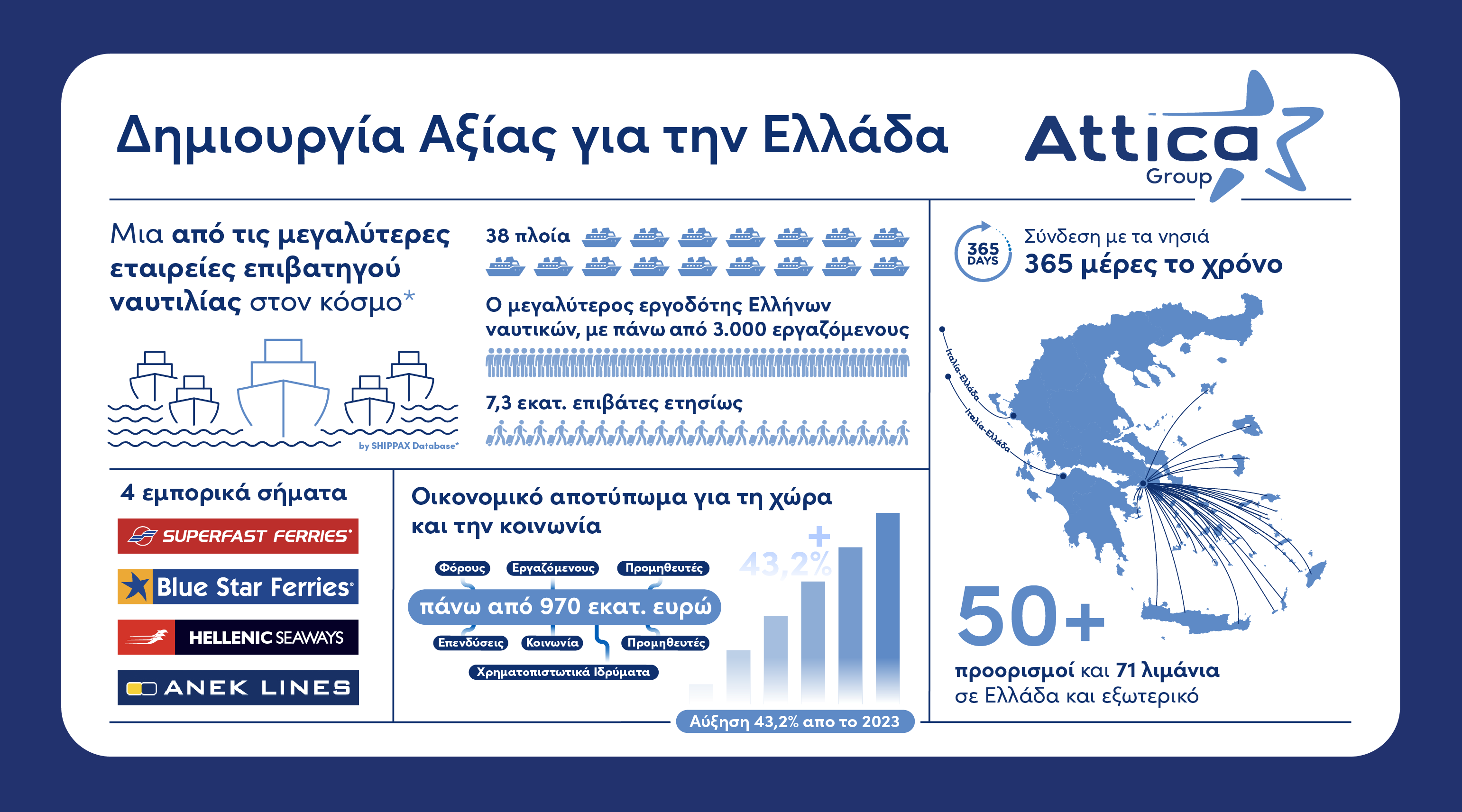 Η αναπτυξιακή πορεία της Attica Group αφήνει εξαιρετικό αποτύπωμα σε τοπικό και εθνικό επίπεδο. Η αύξηση του κύκλου εργασιών της υπήρξε αλματώδης από τα 265 εκατ. ευρώ το 2012, στα 747 εκατ. το 2024. Σύμφωνα με τον απολογισμό Υπεύθυνης και Βιώσιμης Ανάπτυξης, η οικονομική αξία που διένειμε ο Όμιλος για εργαζόμενους, φόρους, παρόχους κεφαλαίου, πράκτορες, προμηθευτές, κοινωνία και επενδύσεις το 2024 ανήλθε σε 974,5 εκατ αυξημένη κατά 43,2% συγκριτικά με το 2023.