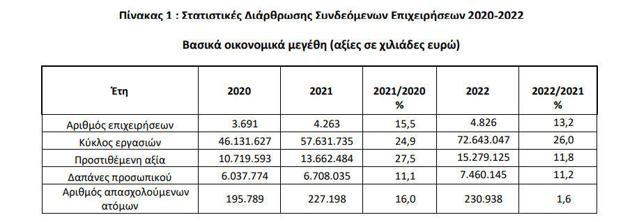 Από τα αποτελέσματα της έρευνας για το έτος 2022 προκύπτει ότι ο συνολικός κύκλος εργασιών των αλλοδαπών συνδεόμενων επιχειρήσεων ανήλθε στα 77,3 δισ. ευρώ.