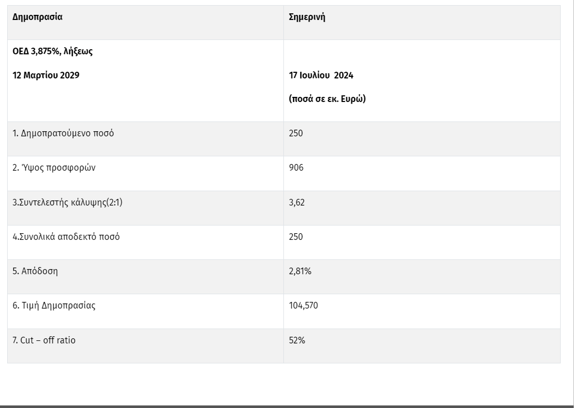 Οι συνολικές προσφορές ανήλθαν σε 906 εκατ. ευρώ και η ημερομηνία διακανονισμού είναι η Τετάρτη 24 Ιουλίου 2024. Όπως ανακοίνωσε χθες ο Οργανισμός Διαχείρισης Δημοσίου Χρέους σήμερα Τετάρτη 17 Ιουλίου 2024 θα διενεργούνταν Δημοπρασία για την επανέκδοση Ομολόγων του Ελληνικού Δημοσίου, σταθερού επιτοκίου 3,875%, λήξης 12 Μαρτίου 2029, σε άυλη μορφή.