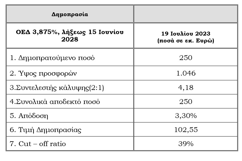 Η δημοπρασία πραγματοποιήθηκε μέσω των Βασικών Διαπραγματευτών Αγοράς (Primary Dealers), ενώ η ημερομηνία διακανονισμού είναι η Τετάρτη 26 Ιουλίου 2023.