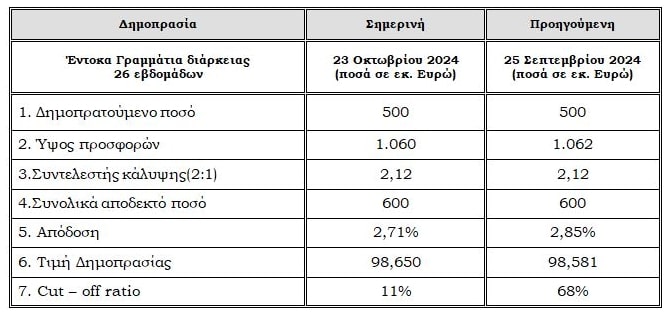 Σημειώνεται ότι στην προηγούμενη αντίστοιχη δημοπρασία, στις 25 Σεπτεμβρίου, η απόδοση είχε διαμορφωθεί στο 2,85%.