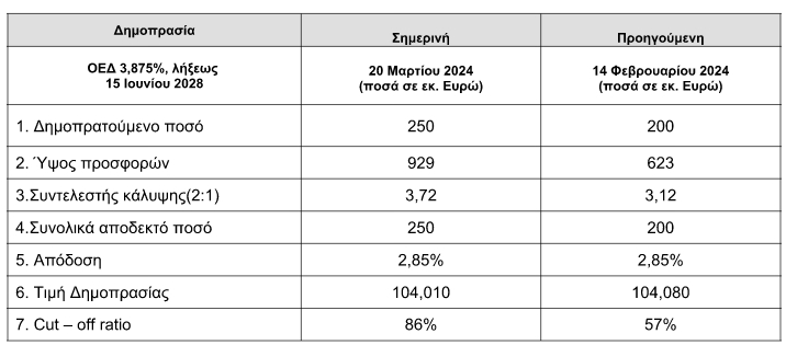 Οι συνολικές προσφορές ανήλθαν σε 929 εκατ. ευρώ και η ημερομηνία διακανονισμού είναι η Τετάρτη 27 Μαρτίου 2024.